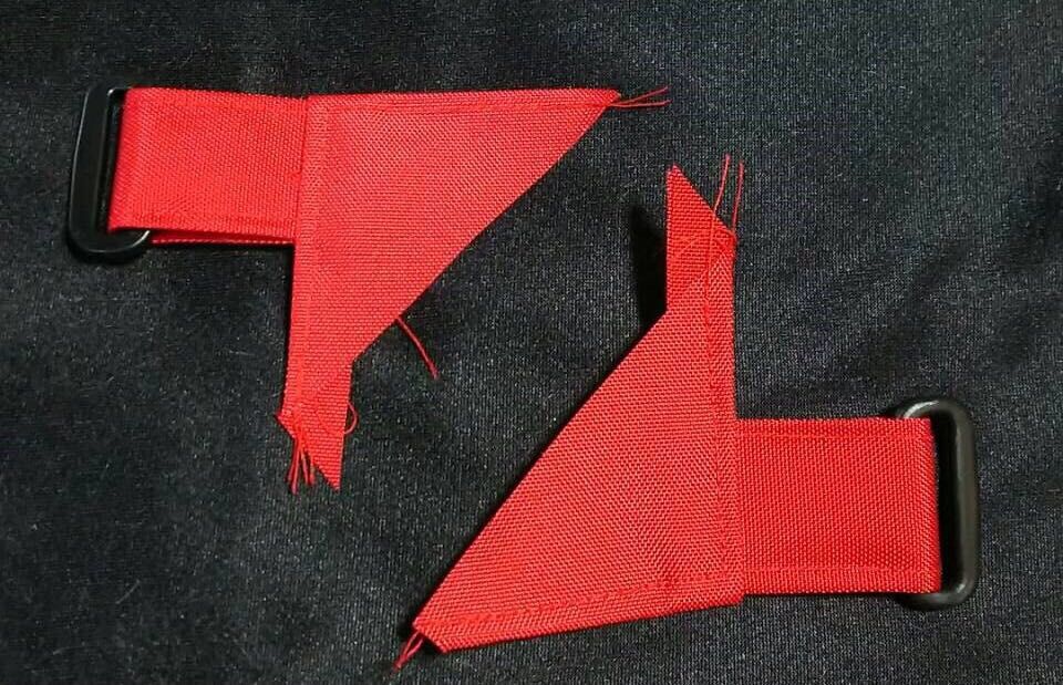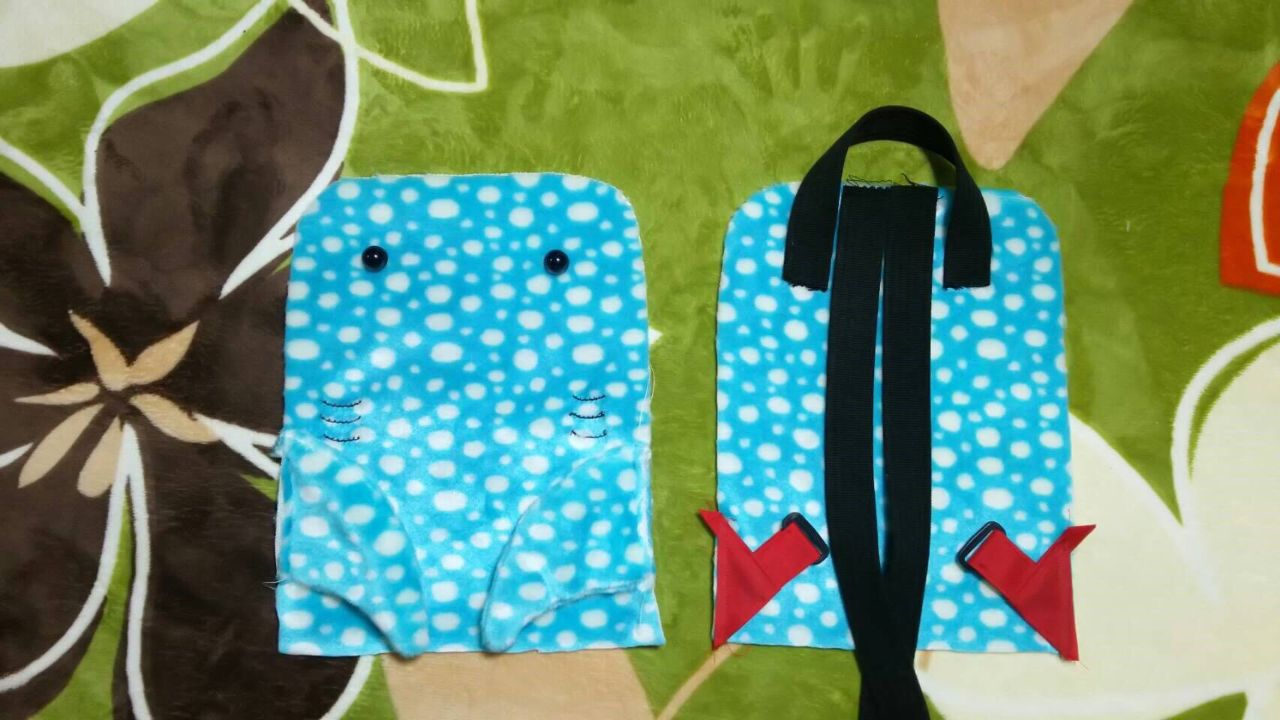 パターンはサメのヒレを想像してつくりました。3️⃣表布の本体を中表に縫います。リュックの紐と、ちから布も縫い止めておきます。
