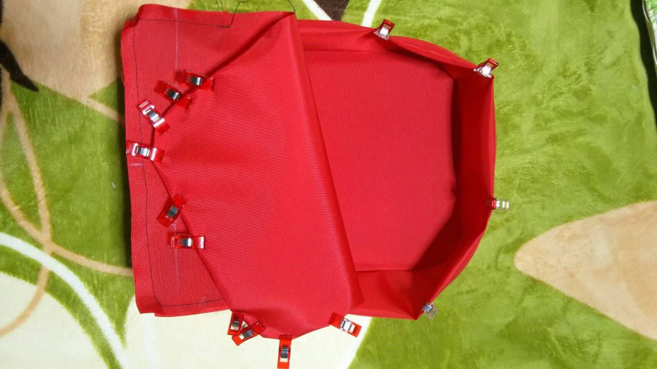 ナイロンは穴があくといけないので、クリップでとめてズレないように縫います。5️⃣表布で作ったリュックの中に、裏布のナイロンで作ったリュックを入れて、まわりをまつります。