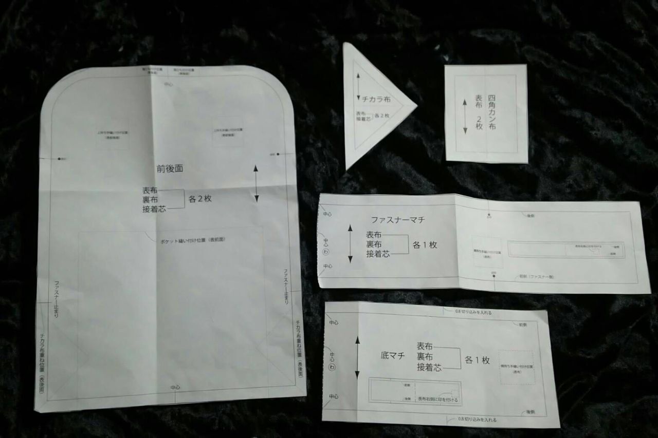 本体部分表布・裏布各2枚、底マチ表布・裏布各1枚、ファスナーマチ表布・裏布各1枚です。パターンにはありませんが、サメのヒレ部分表布のみ、左右対象で各2枚づつ裁断して下さい。
