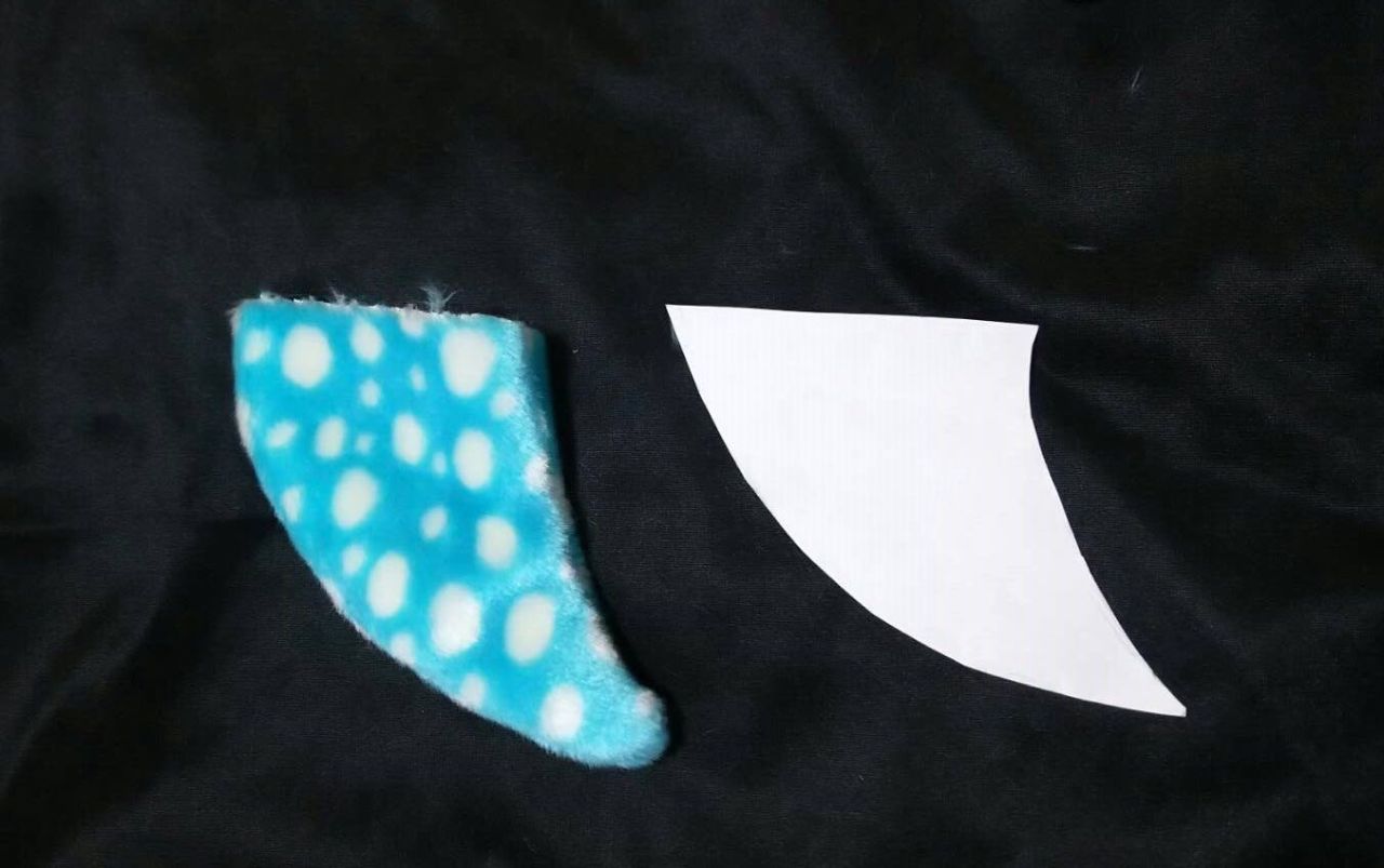 本体部分表布・裏布各2枚、底マチ表布・裏布各1枚、ファスナーマチ表布・裏布各1枚です。パターンにはありませんが、サメのヒレ部分表布のみ、左右対象で各2枚づつ裁断して下さい。2️⃣パターンの中にはありませんが、サメらしくするために、ヒレを作ります。