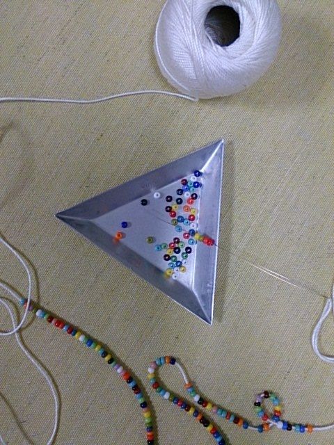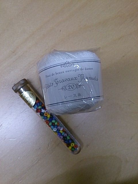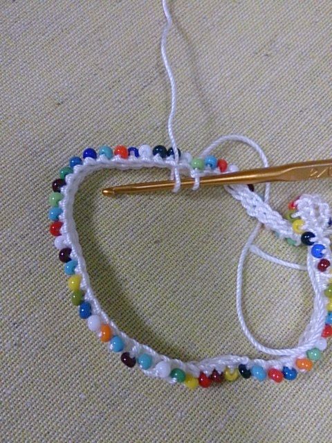 同じ様に四段編みますが、途中で、ビーズが足りなくなったときは、諦めないで、10㎝位で糸を切ります。
