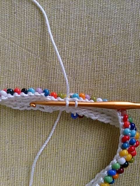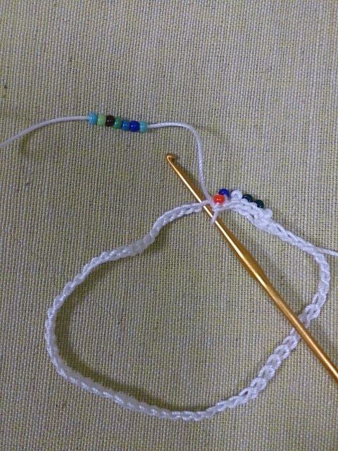 ビーズを引き寄せ立ち上がりの一目にビーズを入れます。