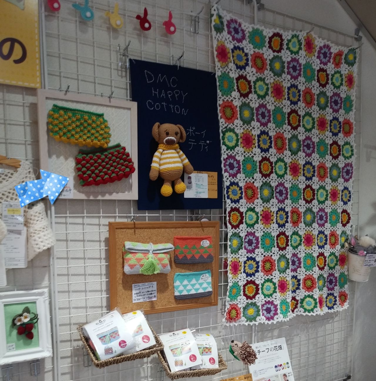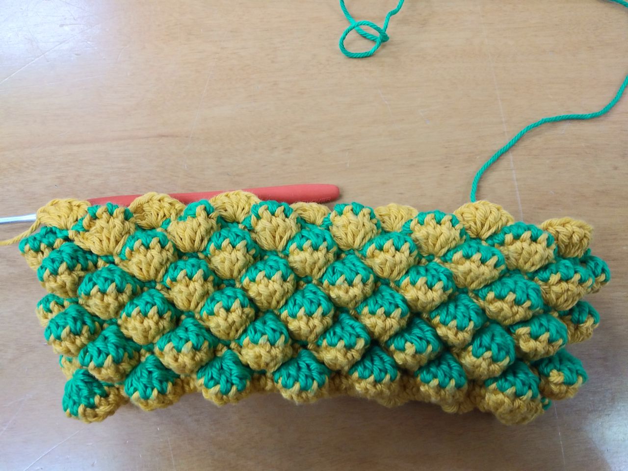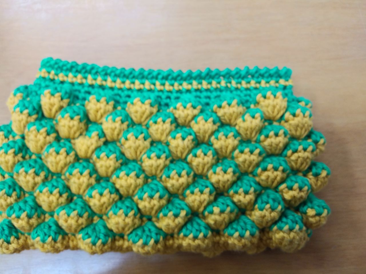 (下)立ち上がりくさり編み1目、前段の頭にくさり編みを3回、次の4目めに長編みを5目編み入れます。一周繰り返しです。