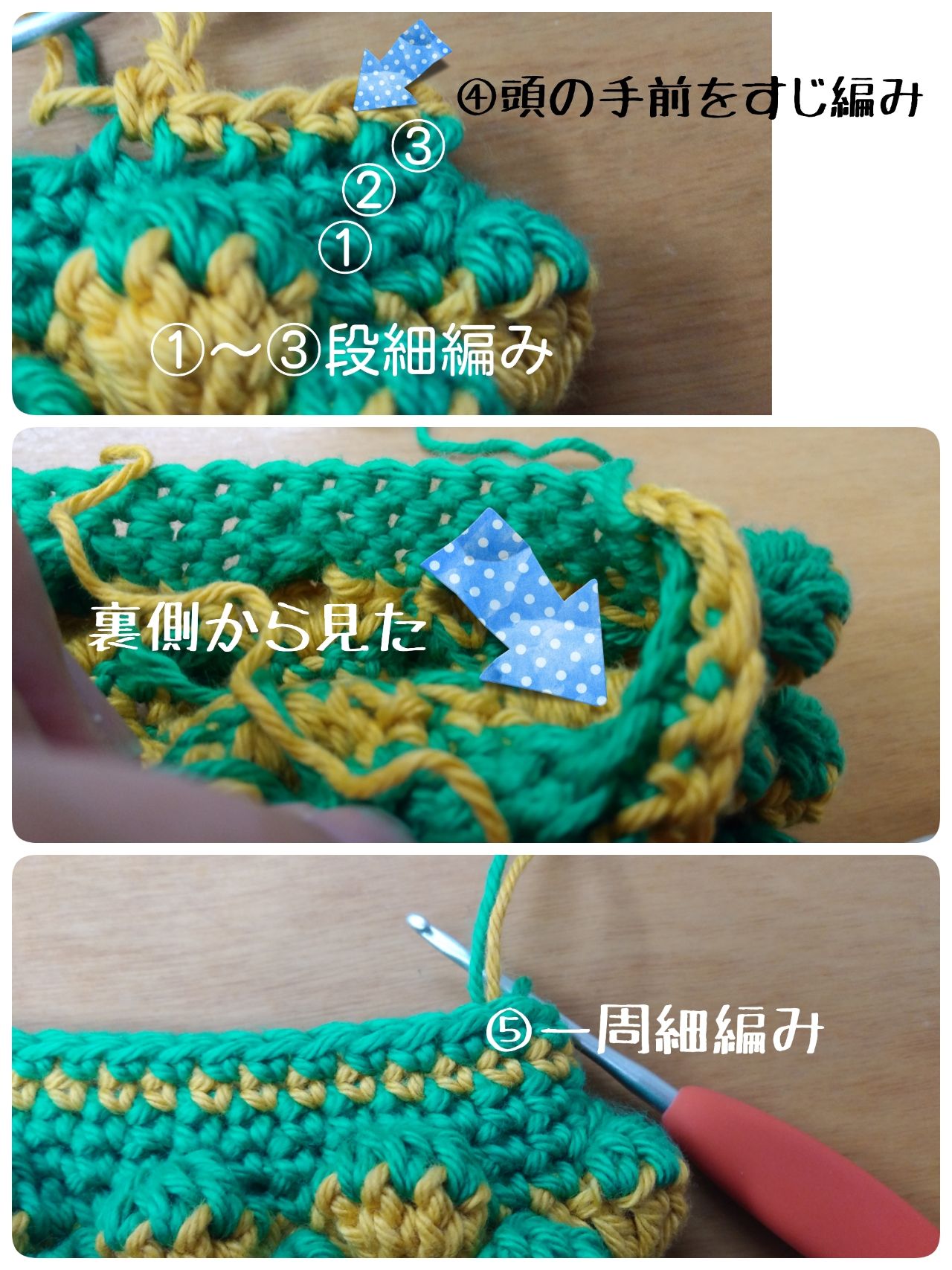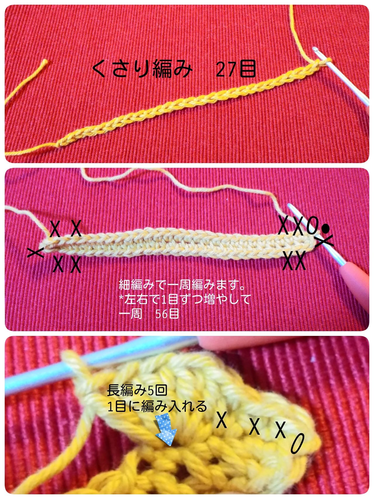 (中)立ち上がりくさり編み1目、細編みを左右に1目ずつ増やして、(上)のくさり編みをぐるっと一周細編み、1目めに引き抜き編み。