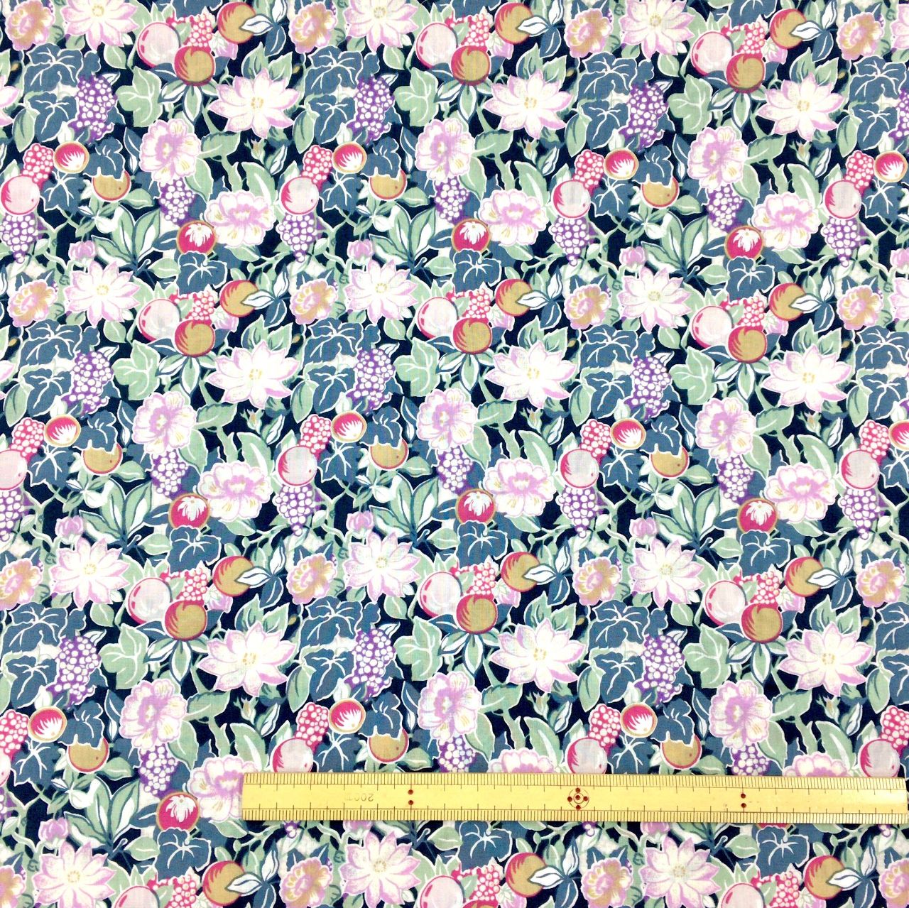 背景の黒に淡いピンクやラベンダーのお花がきわだつ、上品な印象の生地です(^ ^)