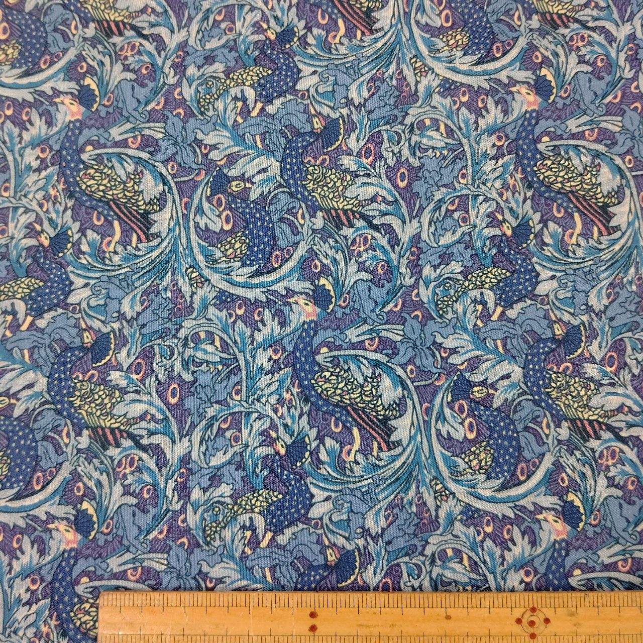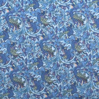 1889年にウォルタークレインが製作したアーツアンドクラフツの壁紙デザイン「ピーコック・ガーデン」をベースにしたこの華麗なプリントは、スクロールするアカンサスの葉と様式化されたチューリップに囲まれた雄大なクジャクが描かれています。