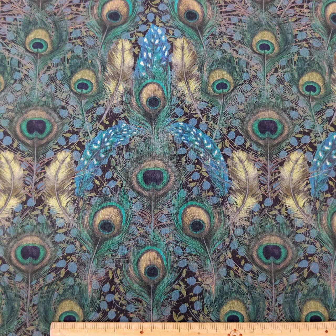 リバティのデザインスタジオにて水彩で描かれた複雑な孔雀やカケス、ホロホロチョウの羽を、クラシックなベリーのデザインのひとつ「エド」に重ねた「ヘラ」の新バージョンです。