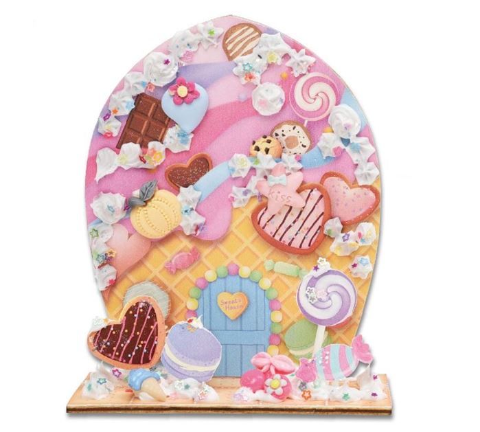 木のベースに紙のパーツが貼ってあり、あとは可愛いパーツとマジカルホイップでデコレーションするだけで、とっても簡単に可愛らしいお菓子のお家が完成します!
