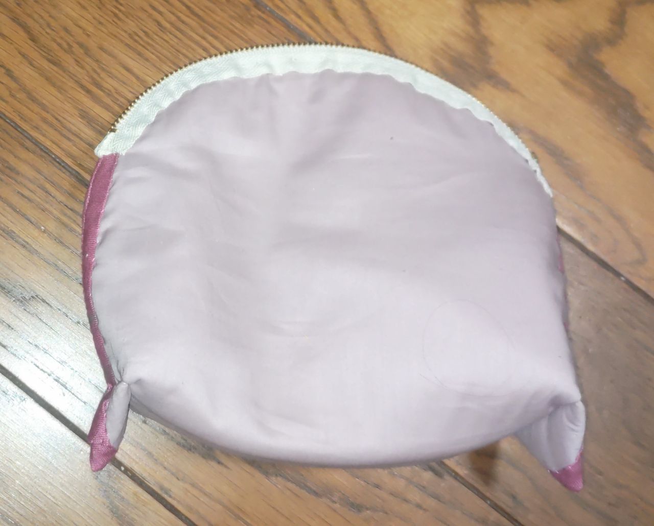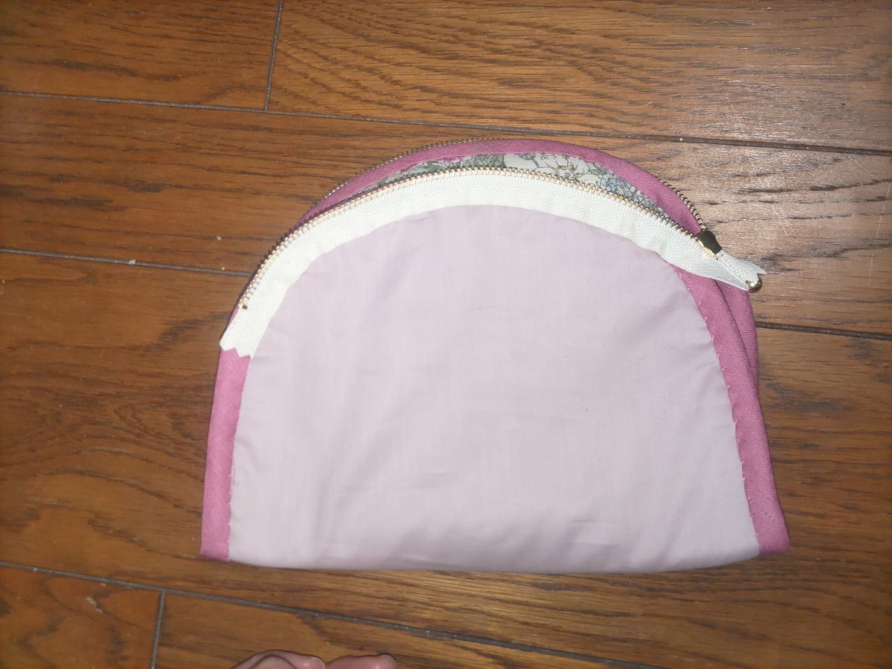 ファスナーを付ける位置に、ファスナーを片側ずつ、返し縫いをしながら、しっかり縫い付けていきます。(ポーチは中表)