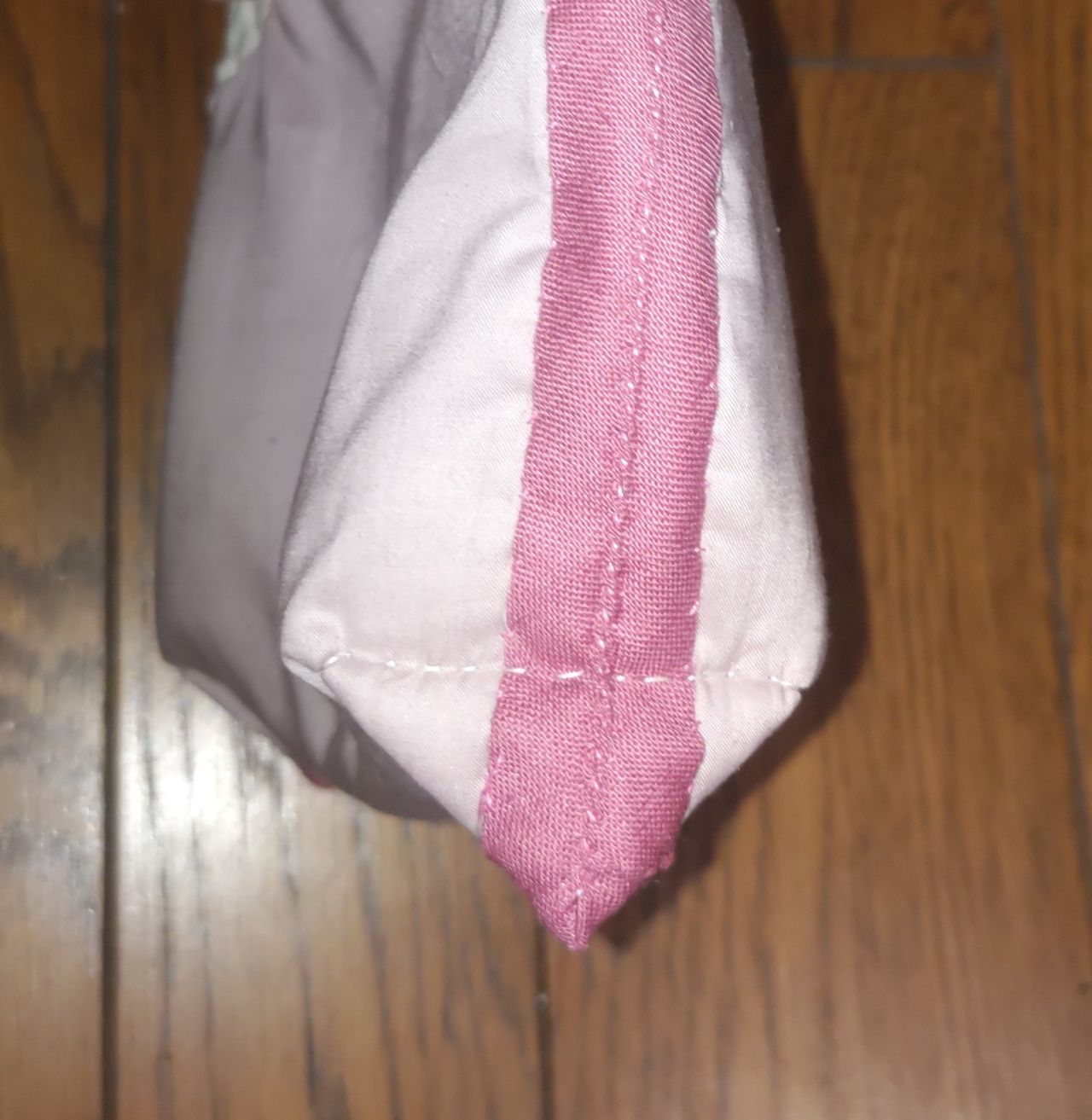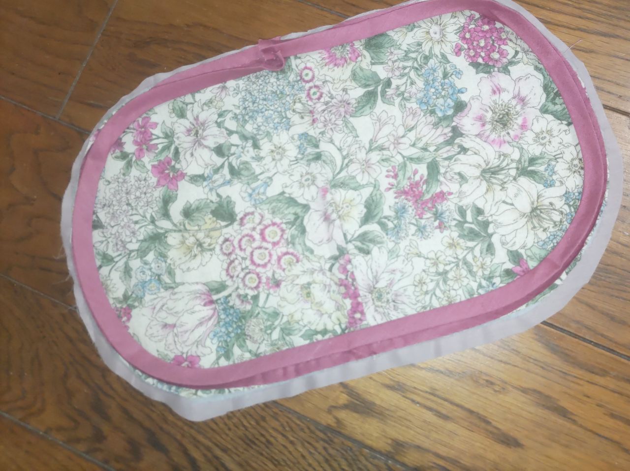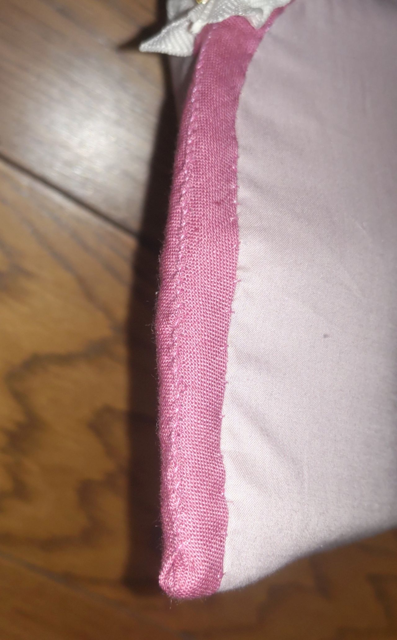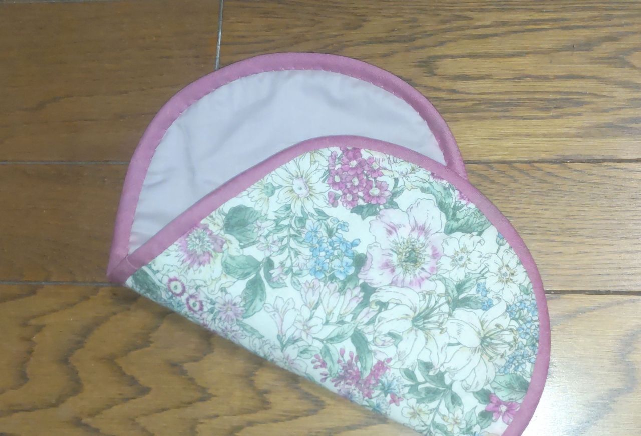 外表に重ねたら、しつけをかけ(まち針や安全ピンなどで留め)、周囲をバイアステープでくるみます。