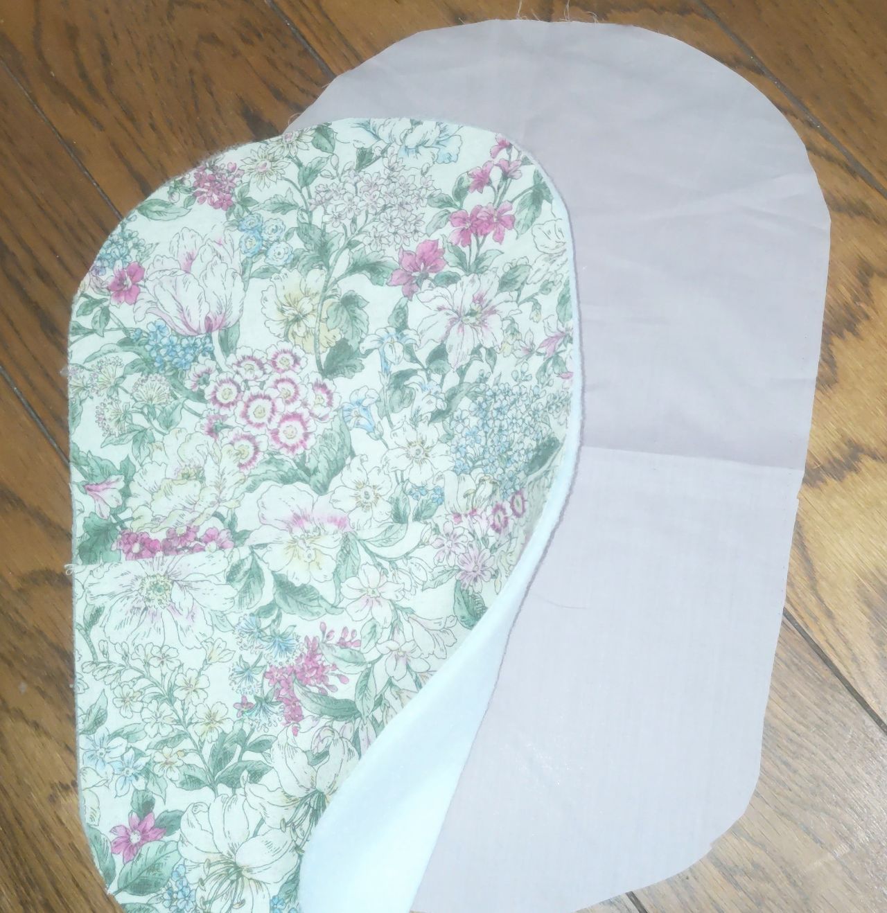では、表布の裏に、接着キルト芯をアイロンで接着して、表布、裏布ともに型紙に沿ってカットしておきます。