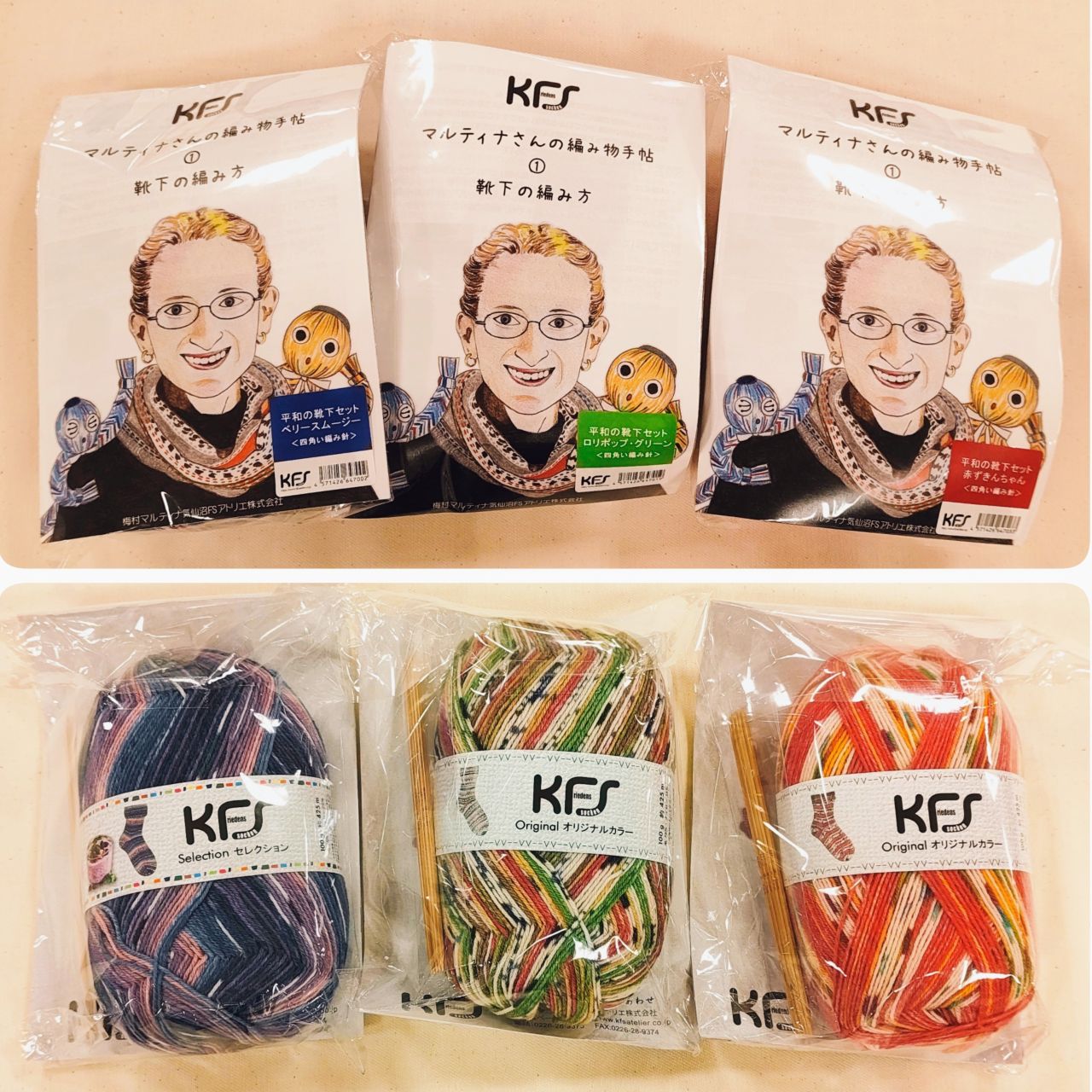 6本よりの【KFSぽっちゃり君】シリーズは編み物初心者さんにもおすすめです。ぽっちゃり君を使用した作品見本も展示中です。