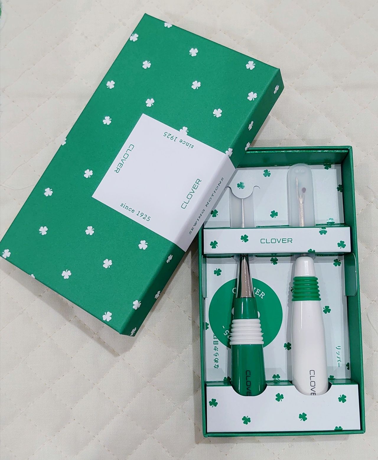 緑×白が爽やかな、なめらか目打ちとリッパーのセットです(^ν^)入っていた箱は収納箱としてご利用いただけます