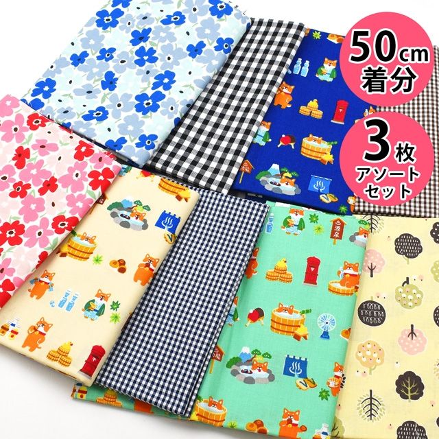 オックス・ツイル・シーチングプリントなどのカットクロス生地を、A~Cの組み合わせの中で3枚お届け。