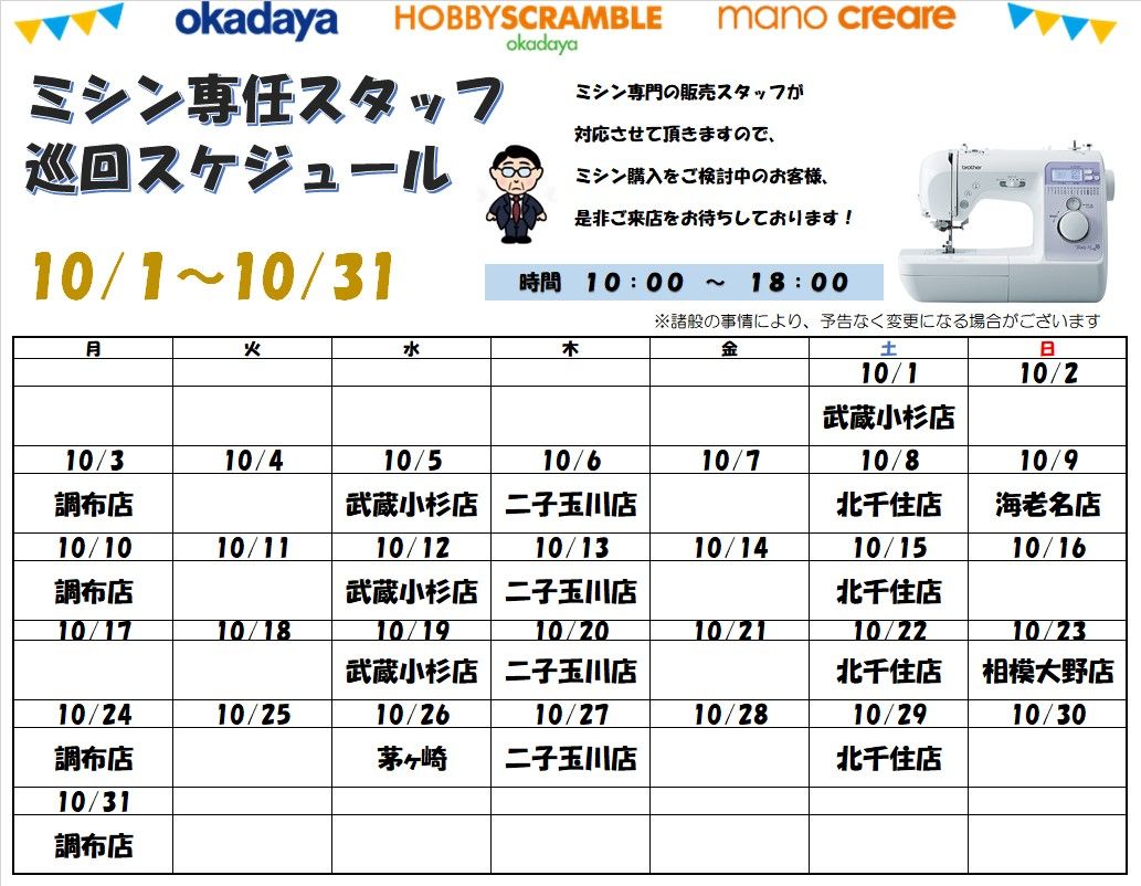 10月【ミシン専任スタッフ巡回スケジュール】