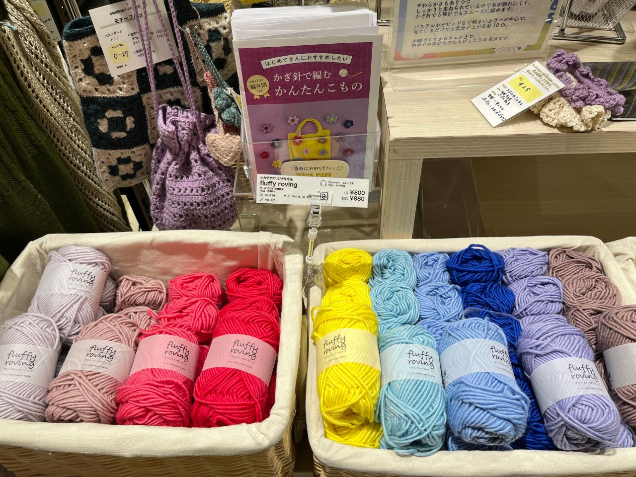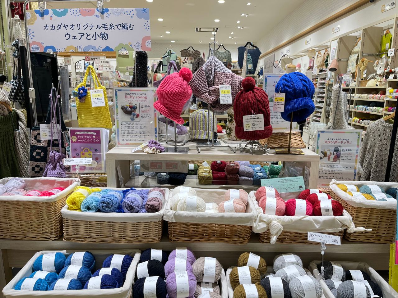 新商品のオカダヤオリジナル毛糸フラッフィーロービングの作品が掲載されたフリー冊子を配布中です♪