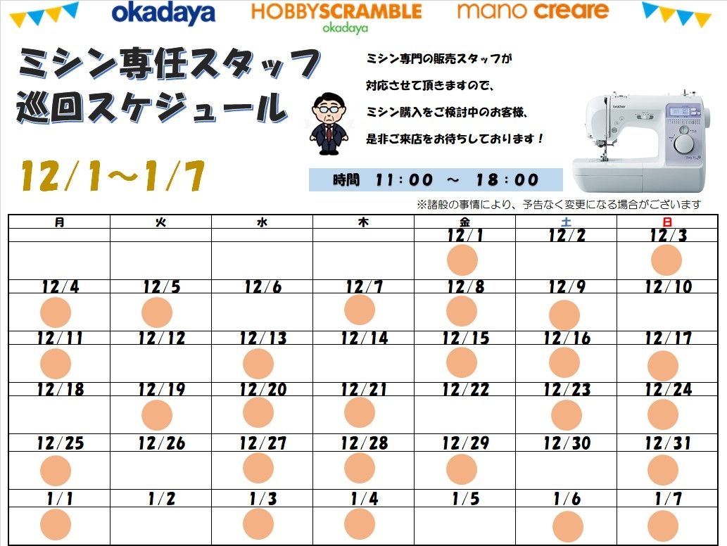 武蔵小杉店ミシン専任スタッフの、在席スケジュールのご案内です。