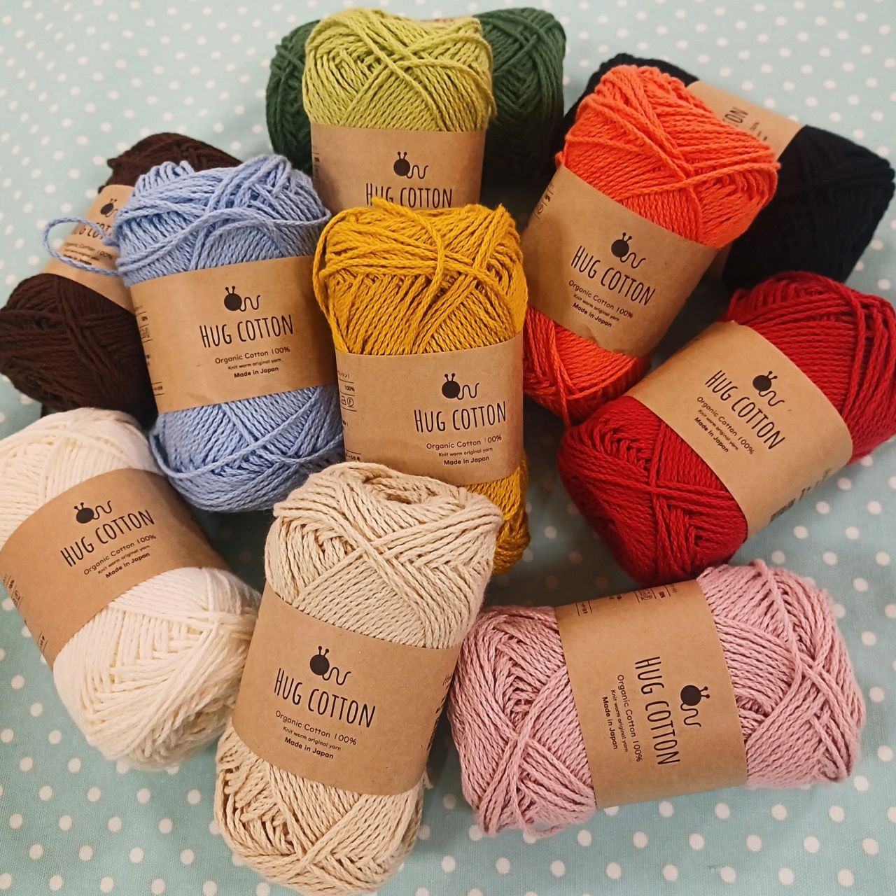 おすわりねこさん、おすわりくまさんの材料に使用の糸で全12色ございます。オーガニックコットン100%、柔らかくてしなやかな糸です。