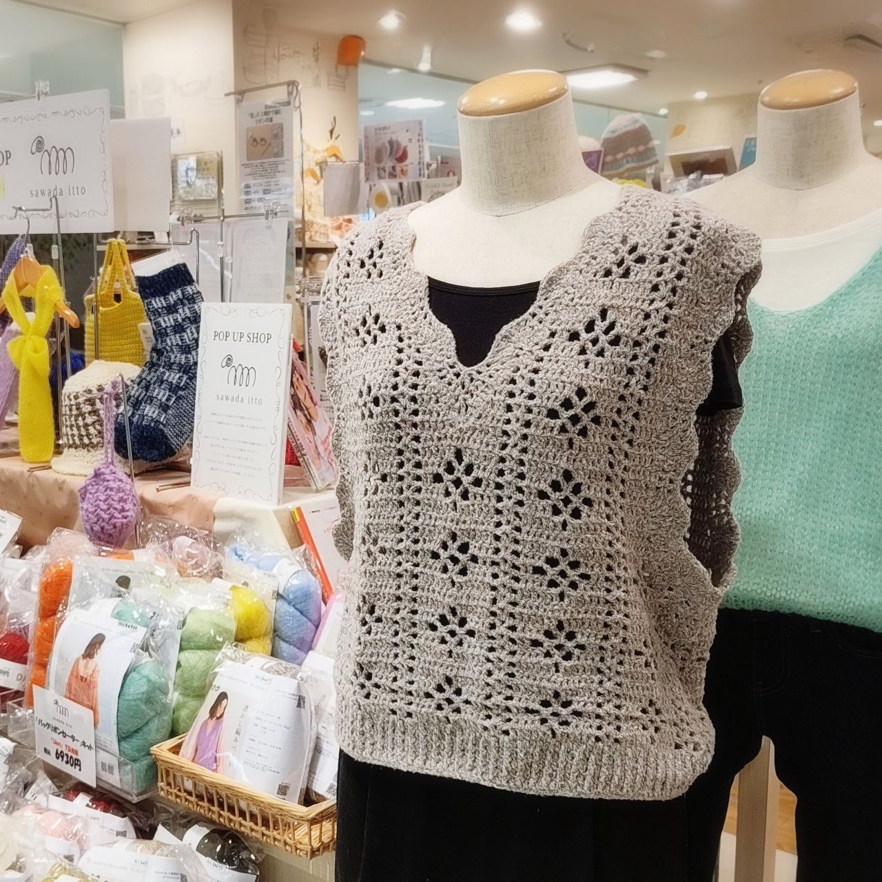 透かし編みベストの見本作品は、ただいま店頭でご覧頂けます。