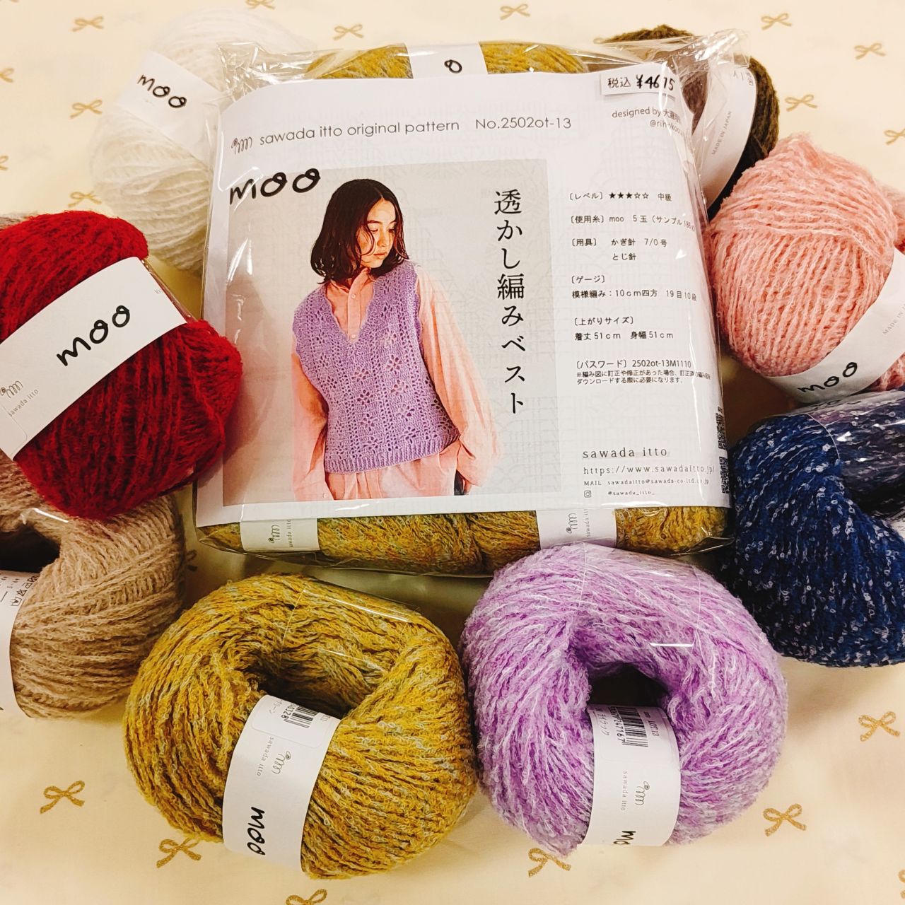 キット表紙のベストは今シーズン入荷したばかりのmoo(厶ー)の新色ライラックです。なみなみのスカラップ模様のようなデザインがとても新鮮で、明るくキュートな印象です。中級者の方にオススメのキットです。