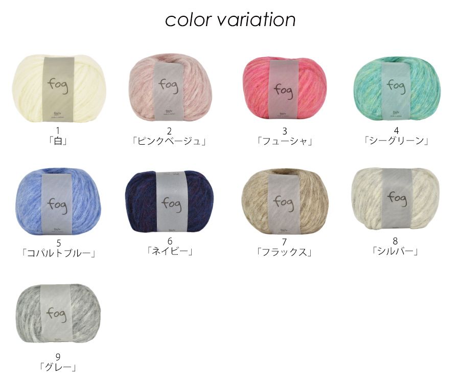 fogはナイロンの芯糸にトップ染めのウール糸を絡ませたチューブヤーンです。