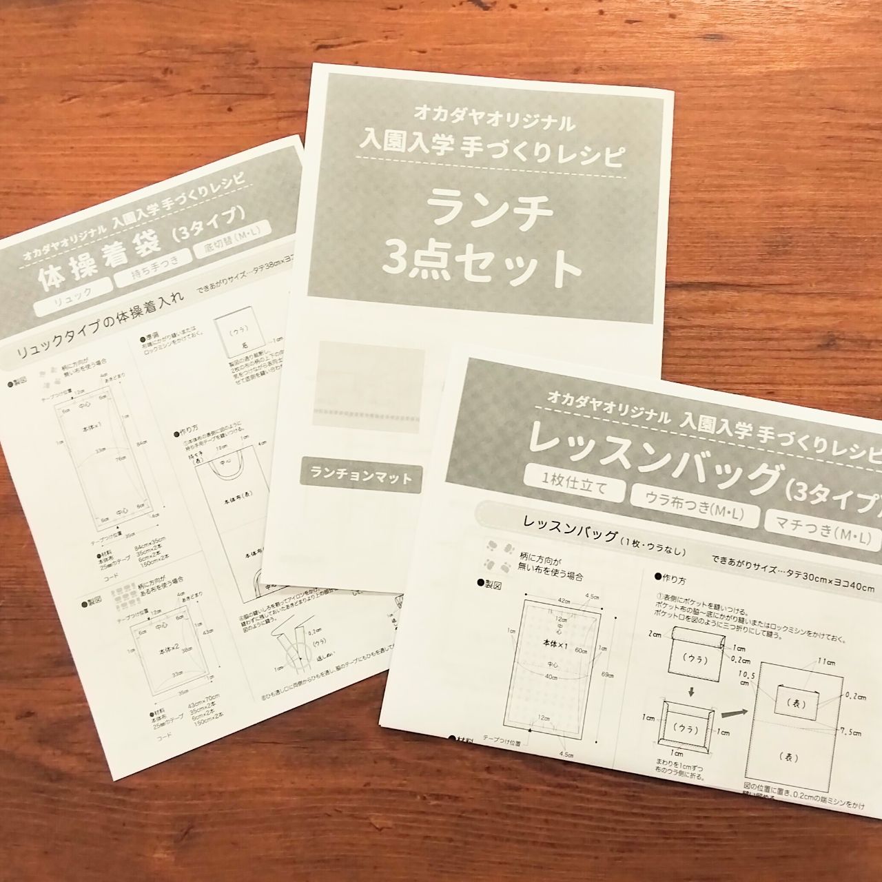 ランチ3点セットの他にも、体操着袋、うわばき入れ、レッスンバッグのレシピのご用意もございますので是非ご利用下さいませ。