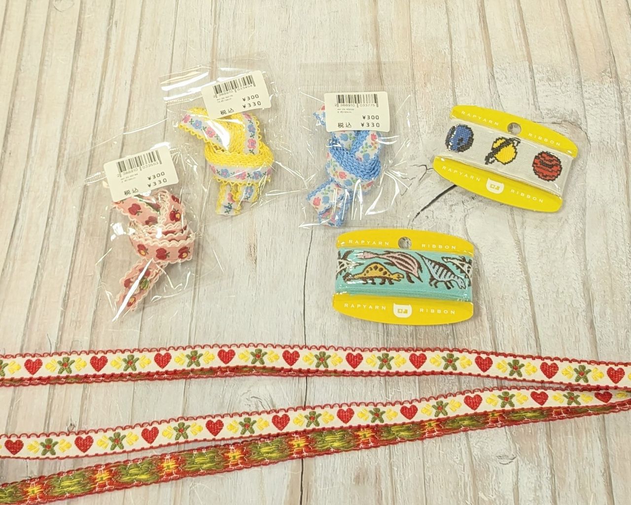 チロリアンテープなどはリボンコーナーの近くにご用意あります。