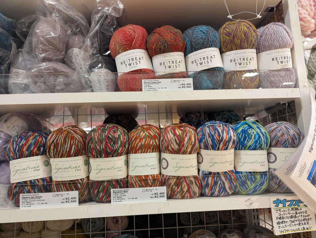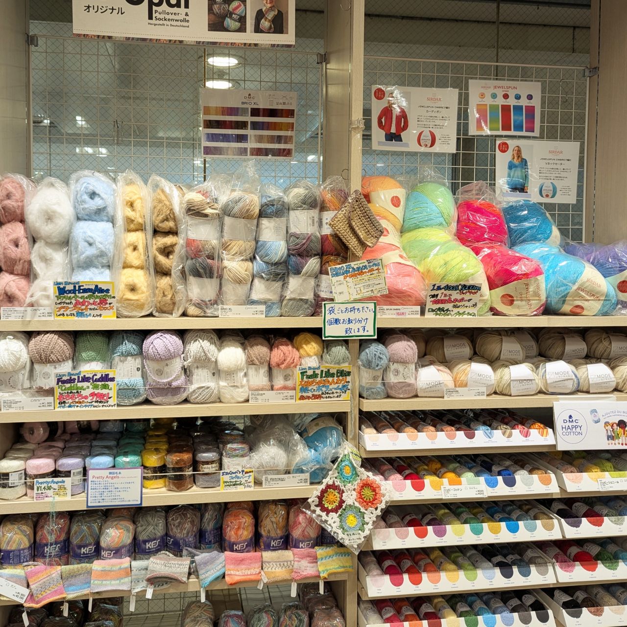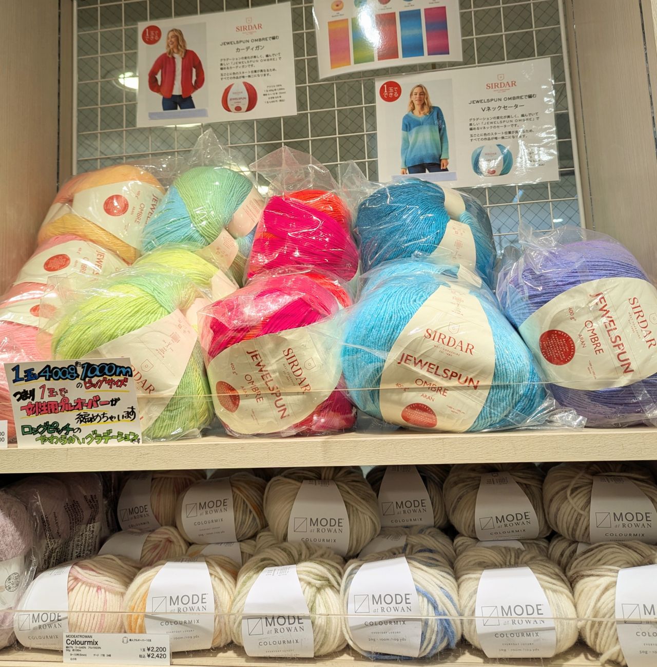Opal毛糸の奥に輸入毛糸が並べてあります。