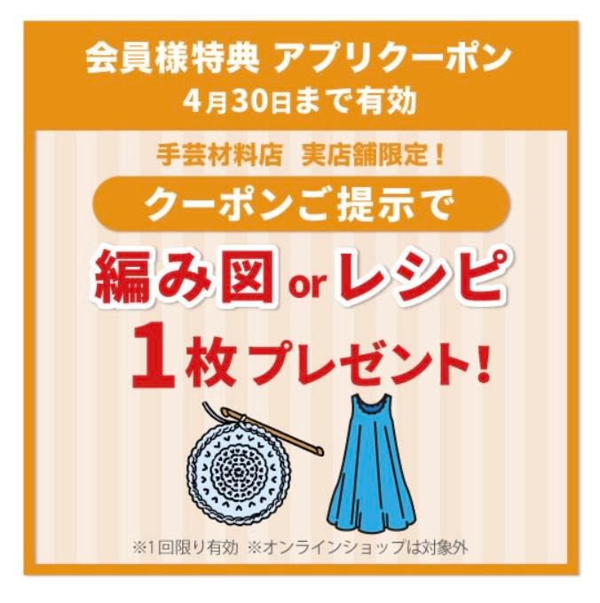アプリ会員様にはレシピ編み図クーポンがございますので、こちらもご利用下さい。