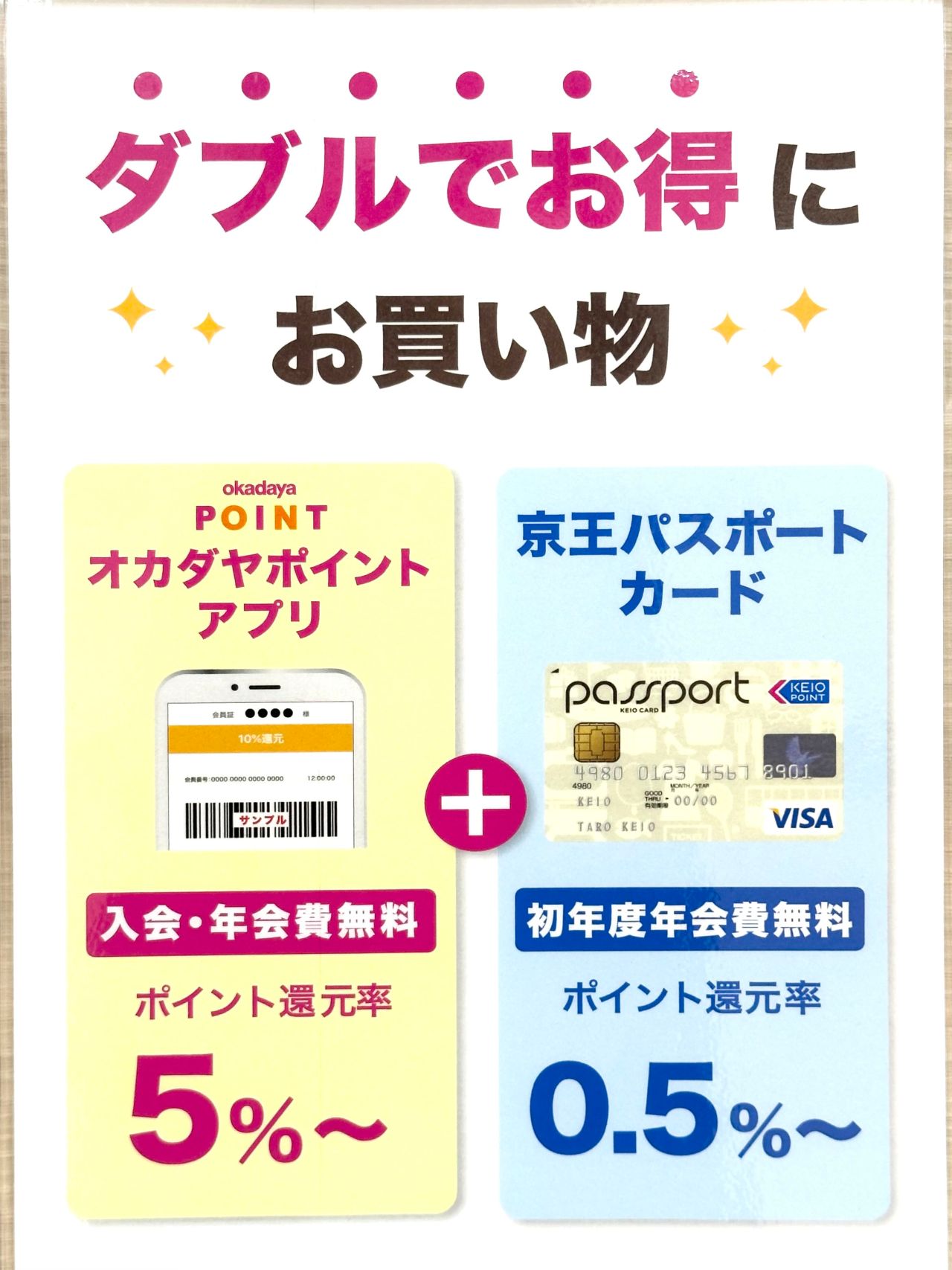 オカダヤ聖蹟桜ヶ丘店では、【オカダヤポイント】と【京王パスポートカードの京王グループ共通ポイント】がダブルで獲得できるのでとってもお得です!