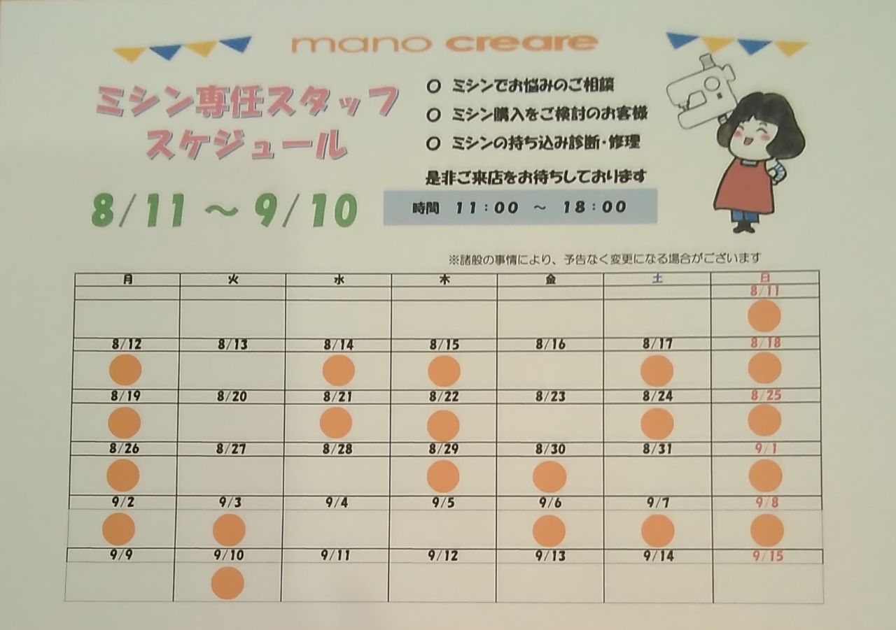 8月【ミシン専任スタッフスケジュール】