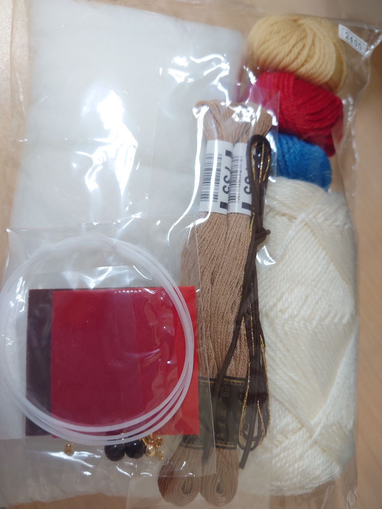 毛糸(4種)、ししゅう糸、レース糸、フェルト、ビーズ(2種)、手芸用わた、目ボタン、形状保持樹脂ワイヤー、丸ゴムひも、作り方説明書