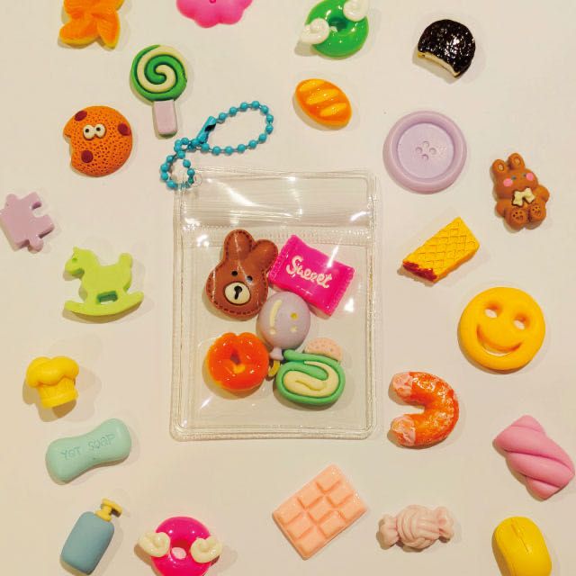 お菓子のようにカラフルでかわいいデコパーツを選んでギュッ!とつめこんだ、オリジナルチャームをお作りいただけます!