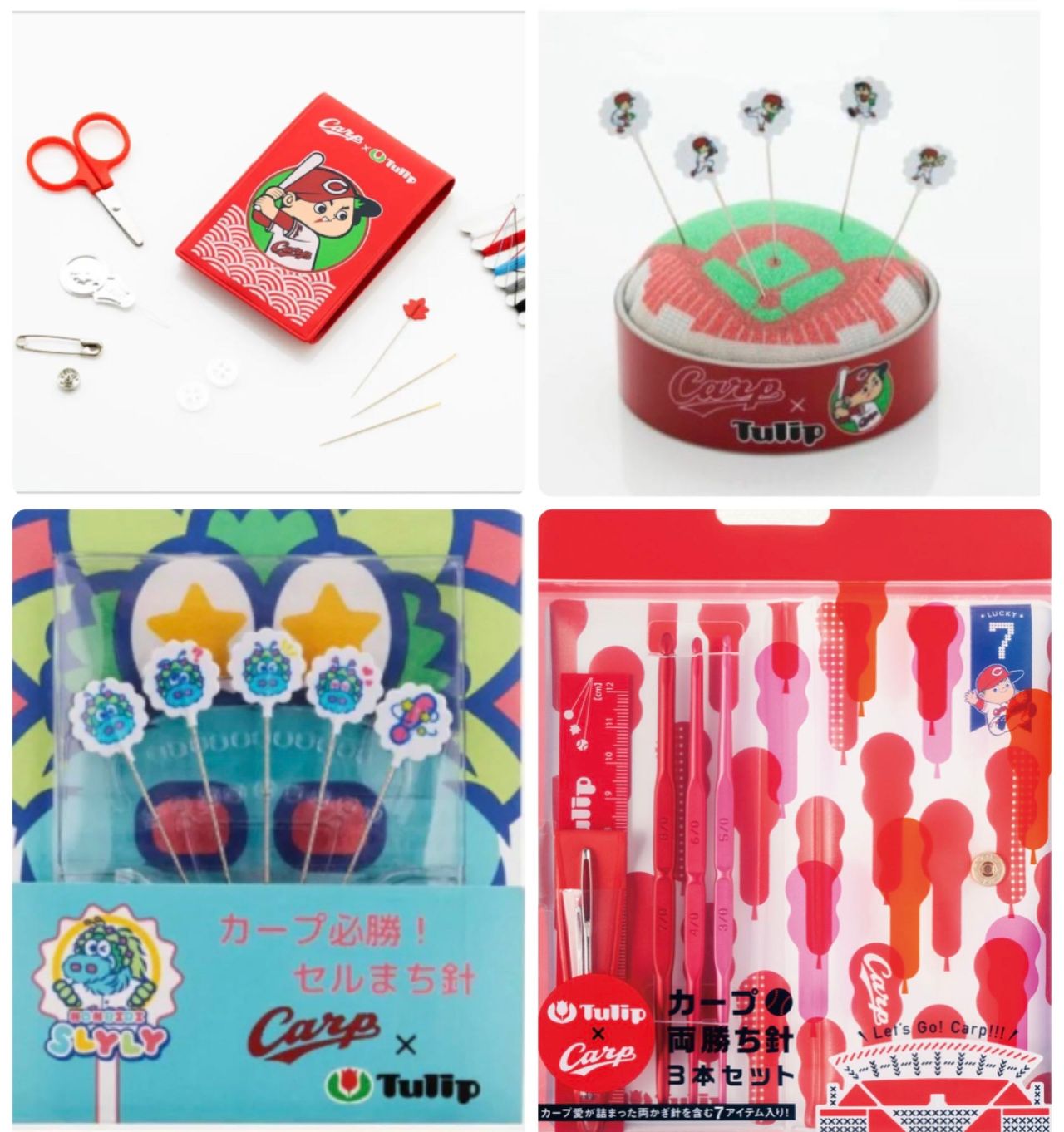 可愛いソーイングセット、球場型ピンクッション、必勝祈願のセルまち針、カープ両勝ち針3本セットなどをご用意しております。