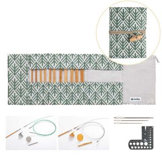 ジャガード織生地のケースで、ベージュとグリーンの2色展開です。職人が仕上げた日本製の切り替え式竹輪針のセットです。