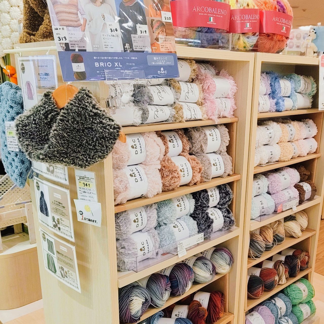 サマラの他、新商品のパステルカラー × ラメのファーヤーン【リッチモア ポーリンラメ】や手触りの良い極太カールヤーン【ニッティングディーバ PERM】もございます。