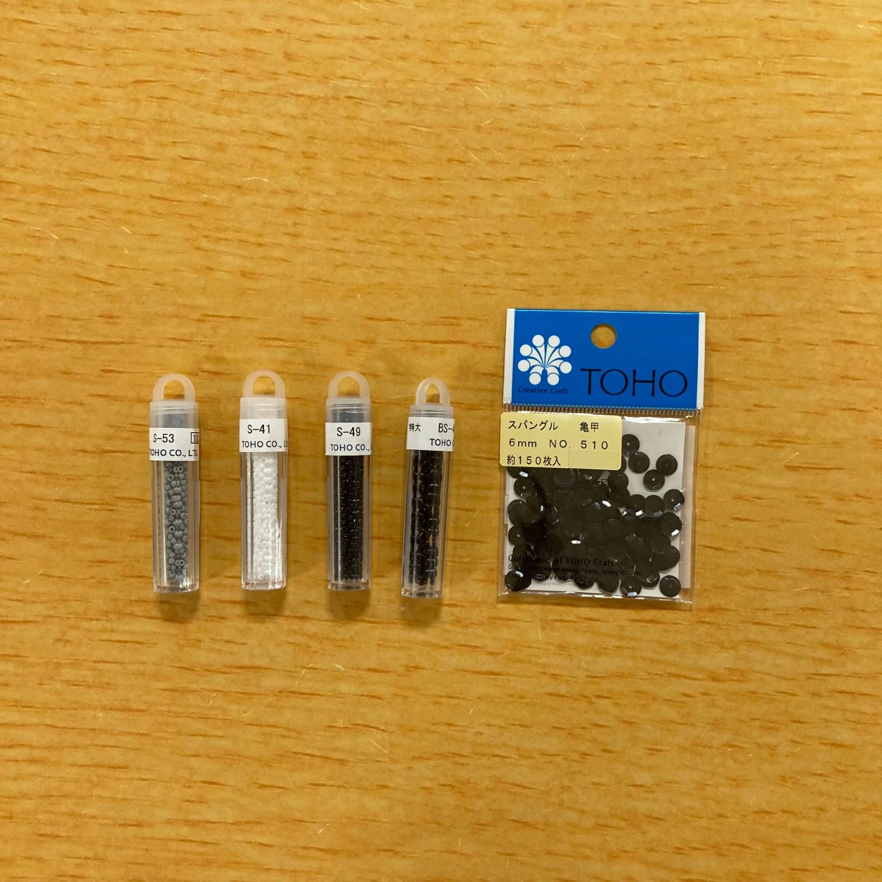ブローチ金具、ビーズ針、糸、フェルト、合皮