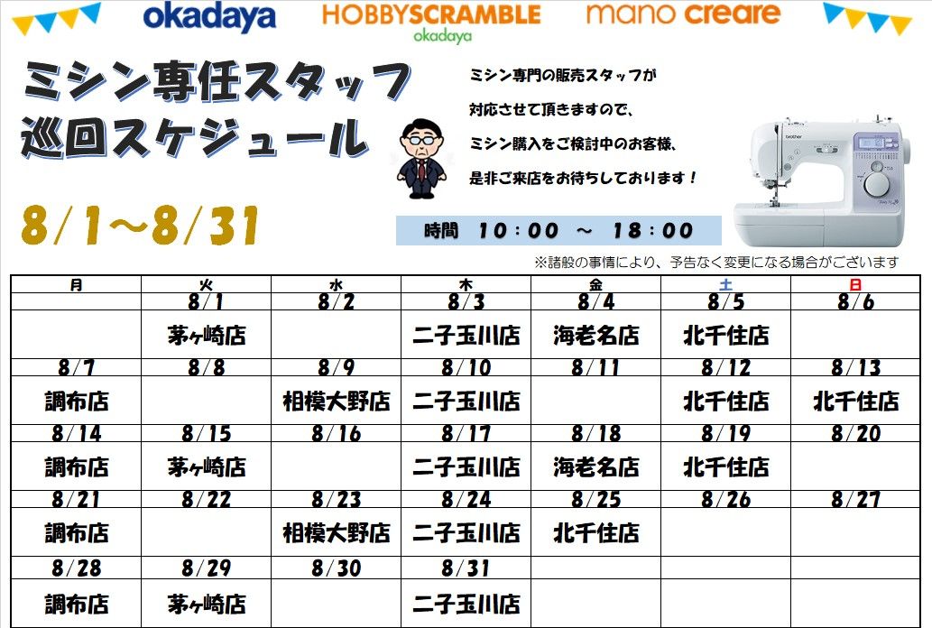 8月【ミシン専任スタッフ巡回スケジュール】