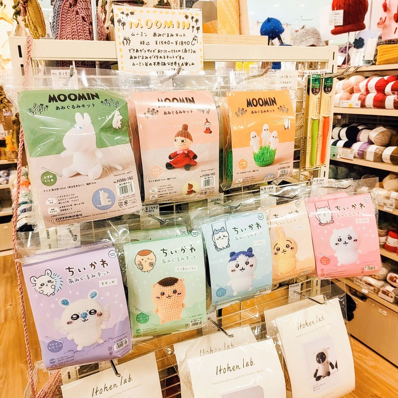 ムーミンあみぐるみキット、ちいかわあみぐるみキットは、相模大野店では、こちらのニットキットのコーナーにございます。