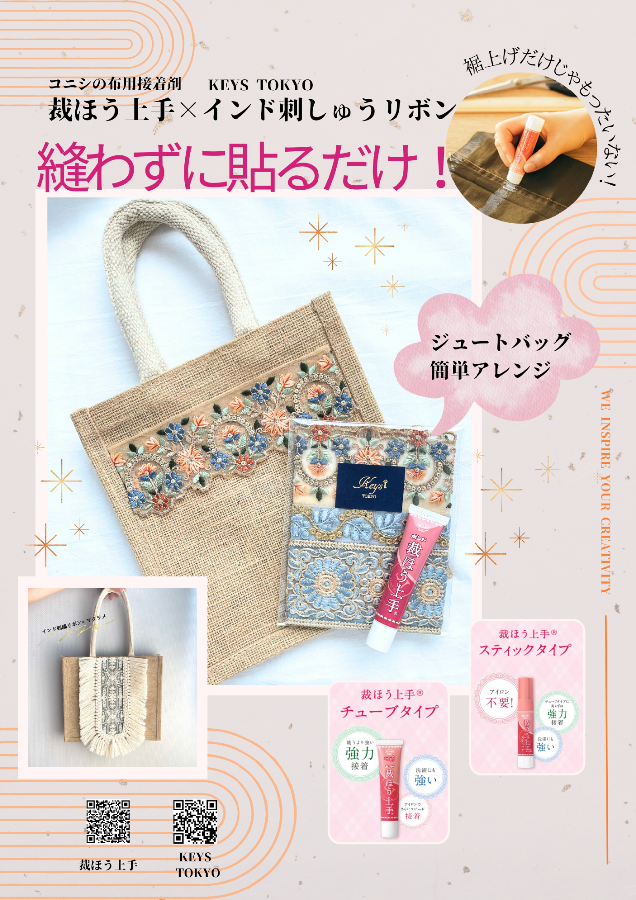 ジュートバッグに裁ほう上手でお好みのインド刺しゅうリボンを縫わずに貼るだけで、おしゃれなオリジナルのバッグが完成します。