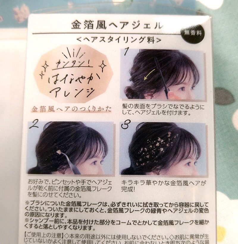 マスカラのようになっていて中に細いラメが入っています。髪に塗って乾く前に金箔風フレークをピンセットや手で乗せるだけです。