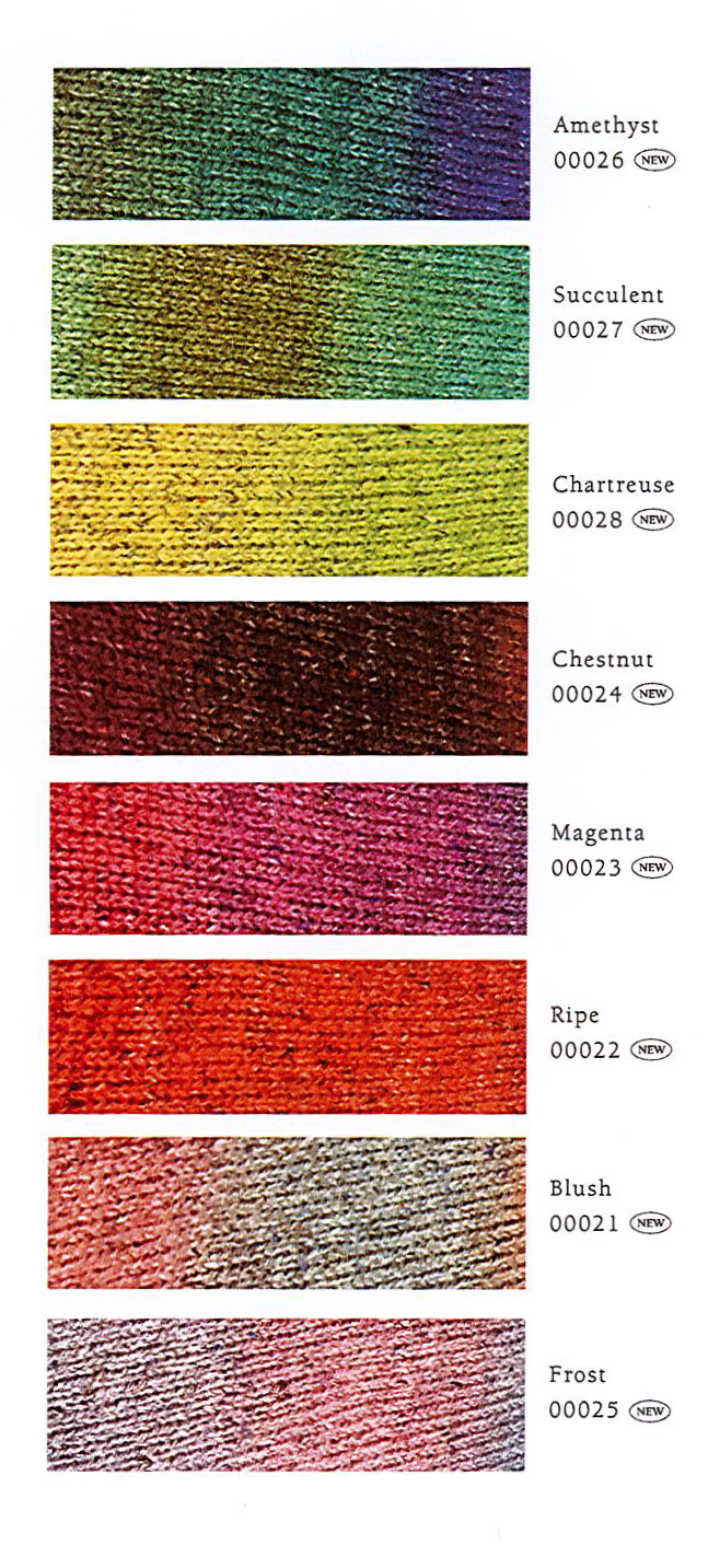 今期は豊かな色彩感覚で絶大な支持を得ている装飾デザイナーのKaffe Fassettによってロングピッチの段染めカラーがデビューしました。
