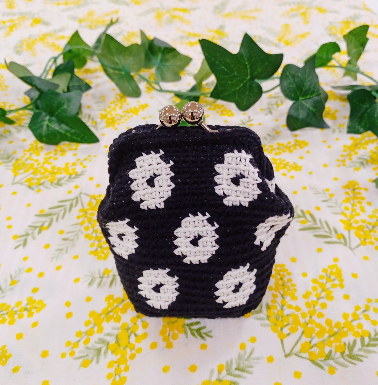 花模様のがま口の実物見本を展示中です。カポックコットン5番色(黒)、1番色(白)を各1玉使用。口金は、編みつける口金7.5cm(銀) を使用しています。