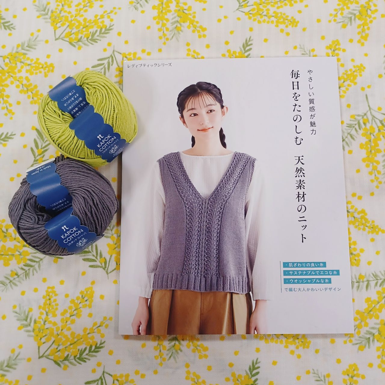 新入荷のこちらの書籍表紙のベストはカポックコットンで編まれています。春夏向きのウェア、小物レシピが25種類掲載。天然素材のやさしい風合いがお好きな方は、ぜひご覧ください!