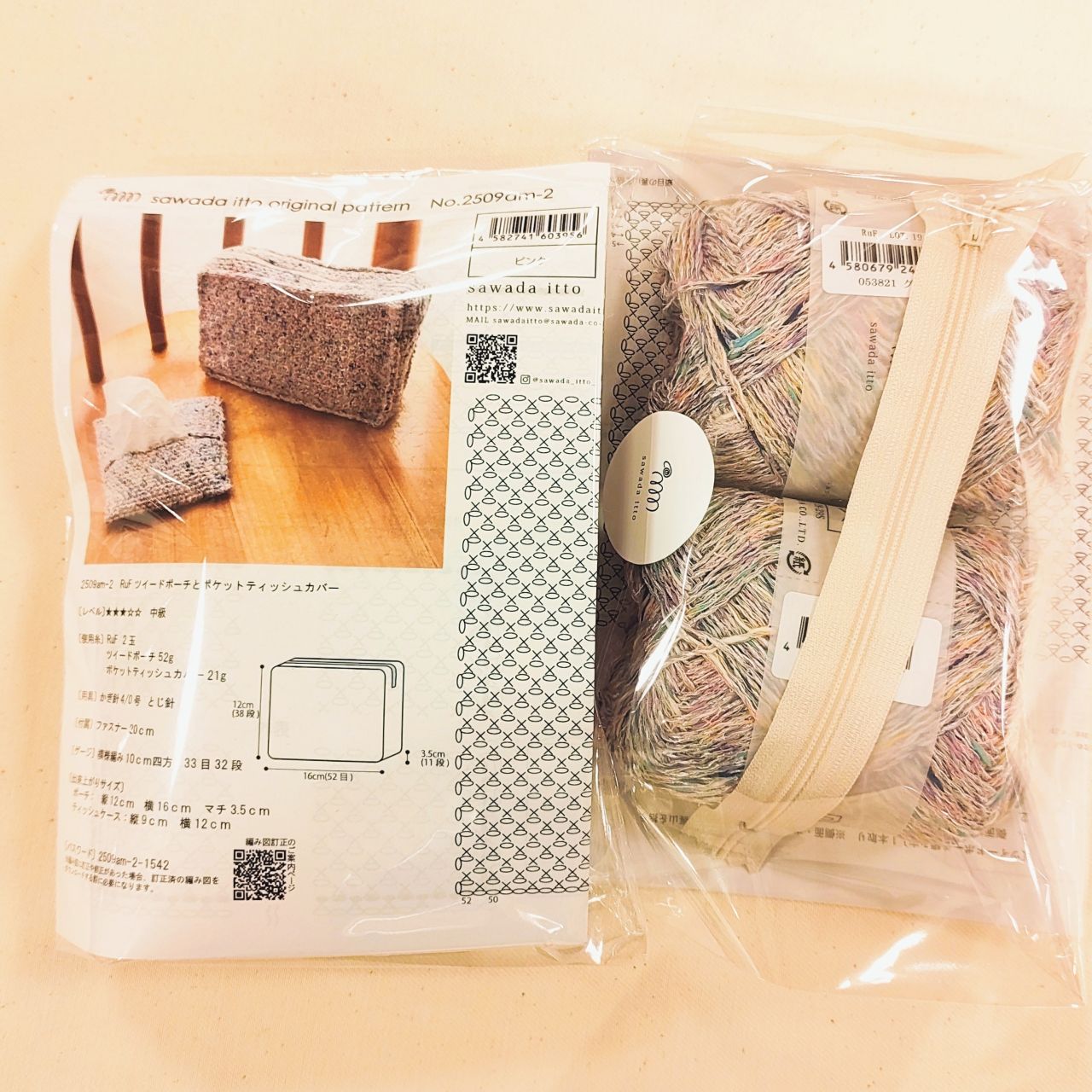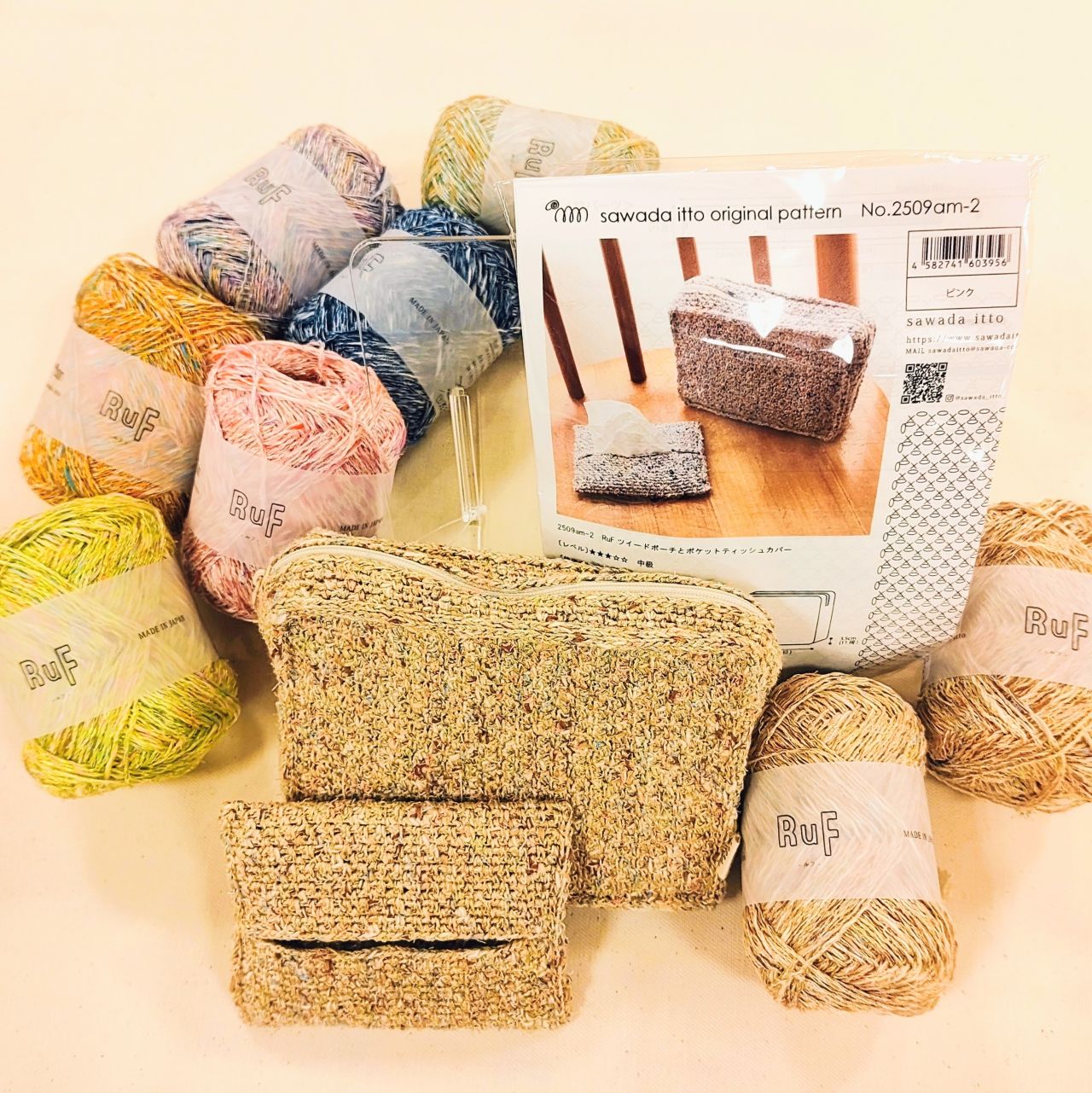 RuF2玉、ファスナー、編み図付きのキットで、ツイードポーチとティッシュケースのどちらもお作りいただけます。