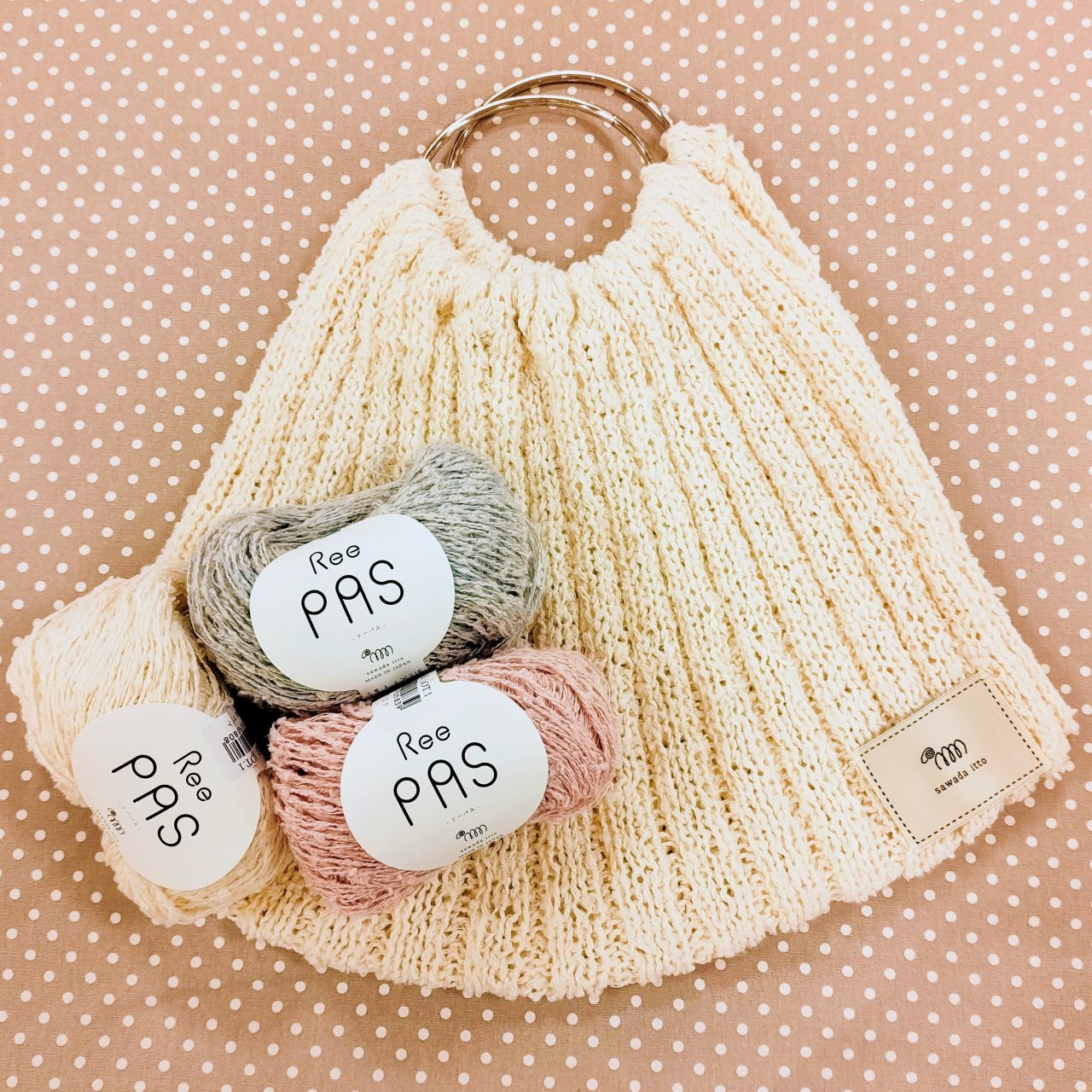 材料の糸は、2026年春夏の新作手編み糸 ReePAS(リーパス)を使用。メタルのリング持ち手がポイントになって、バッグ本体の柔らかな素材感がより引き立ちます☆