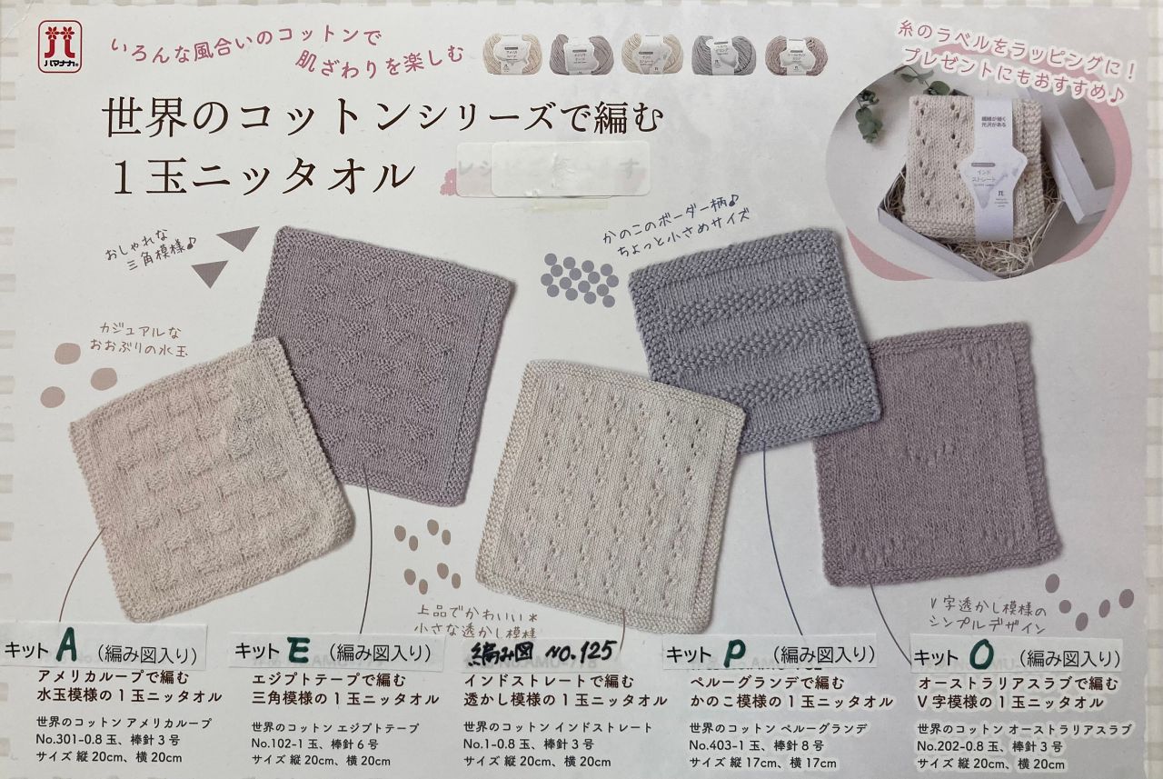 当店ではニッタオルコーナーにて、編み図入りのキットをご用意しております。