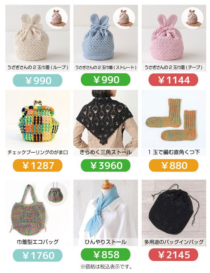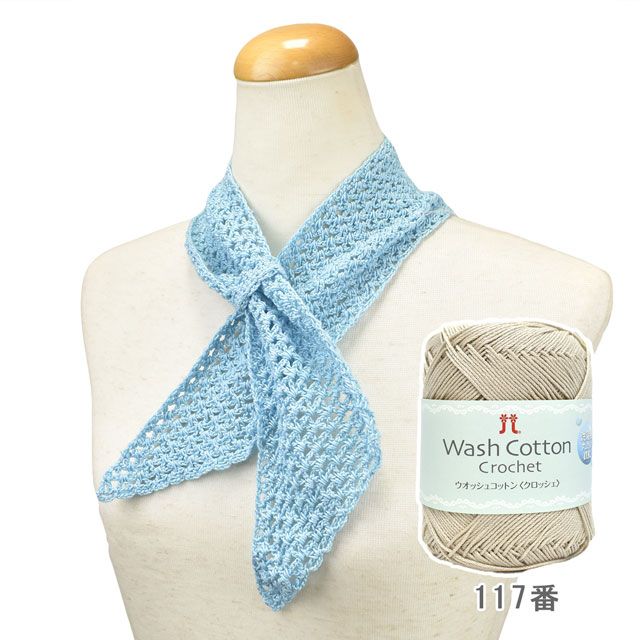 夏の定番「ウオッシュコットン」からは「ウオッシュコットンクロッシェ」のキットを2種類。ウオッシュコットンシリーズは洗濯機で丸洗いできるのがうれしいサマーヤーン。
