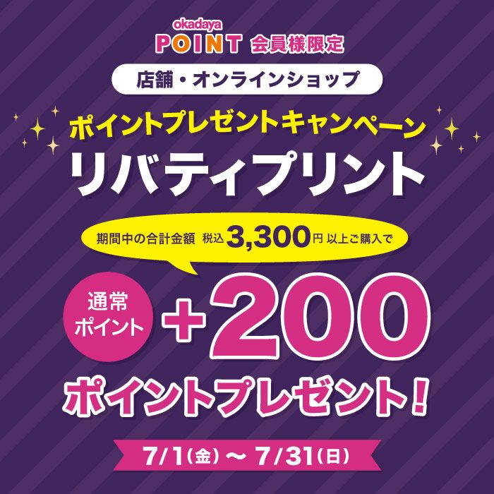 期間中に対象商品を合計金額 3,300円(税込)以上 ご購入されたオカダヤポイント会員様