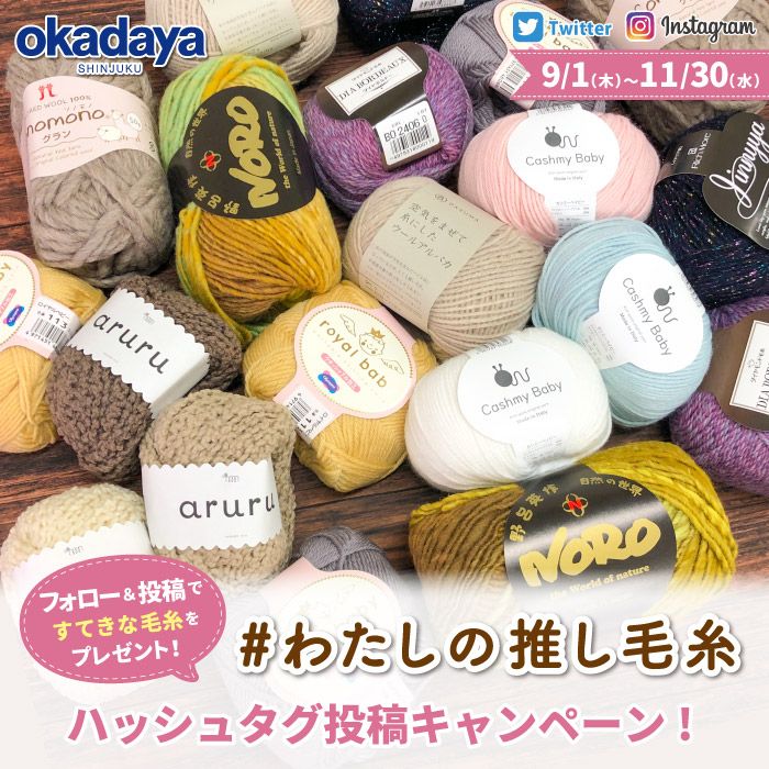 TwitterやInstagramで「#わたしの推し毛糸」をシェアしてくださった方に、オカダヤバイヤーの推し毛糸をプレゼントするキャンペーンを開催いたします!